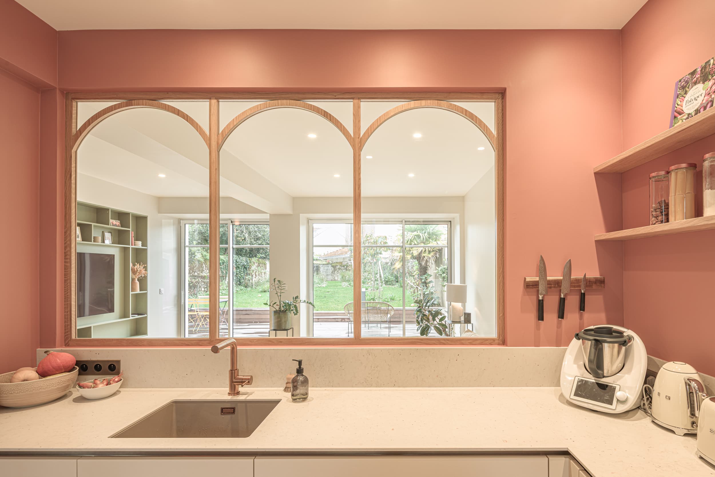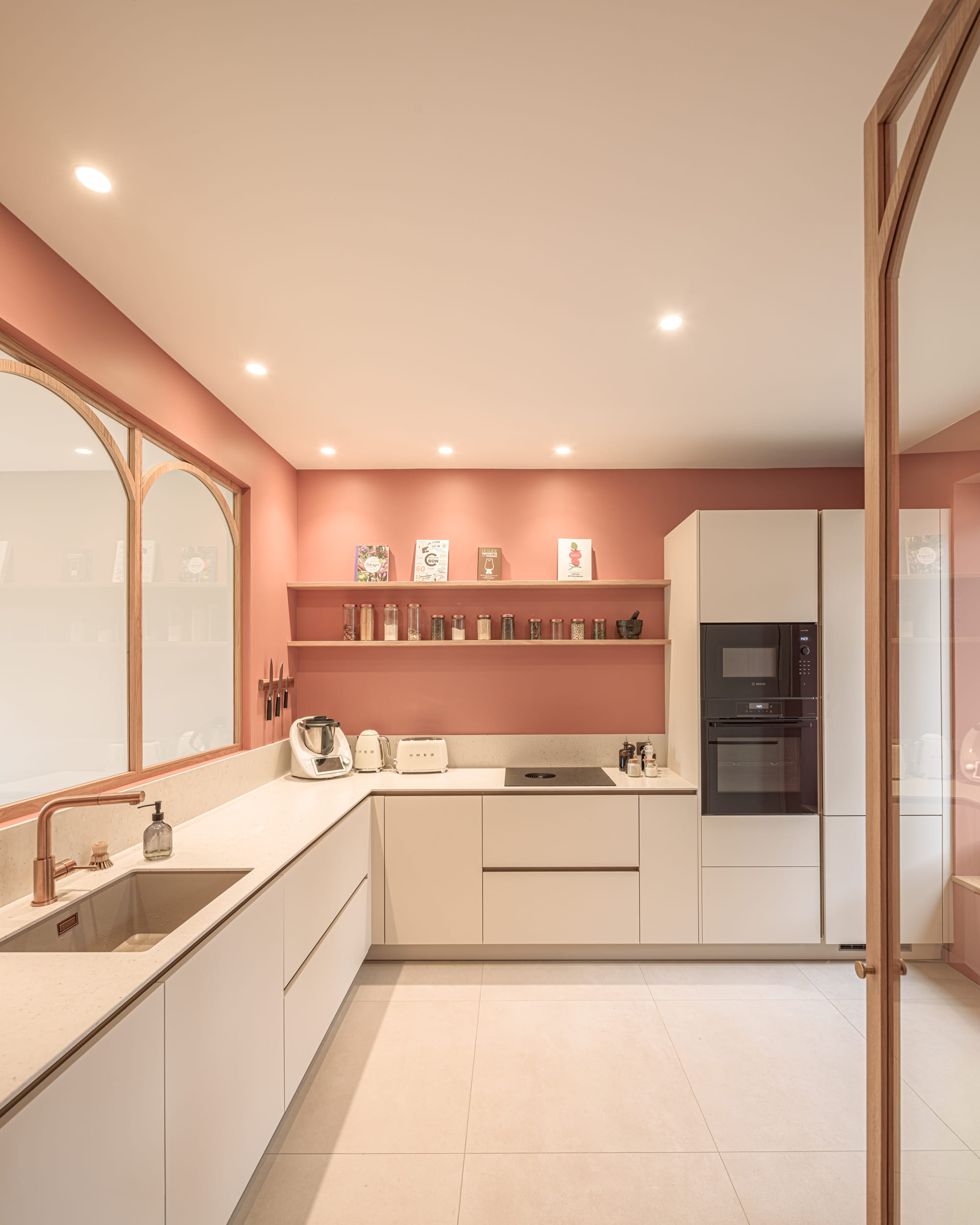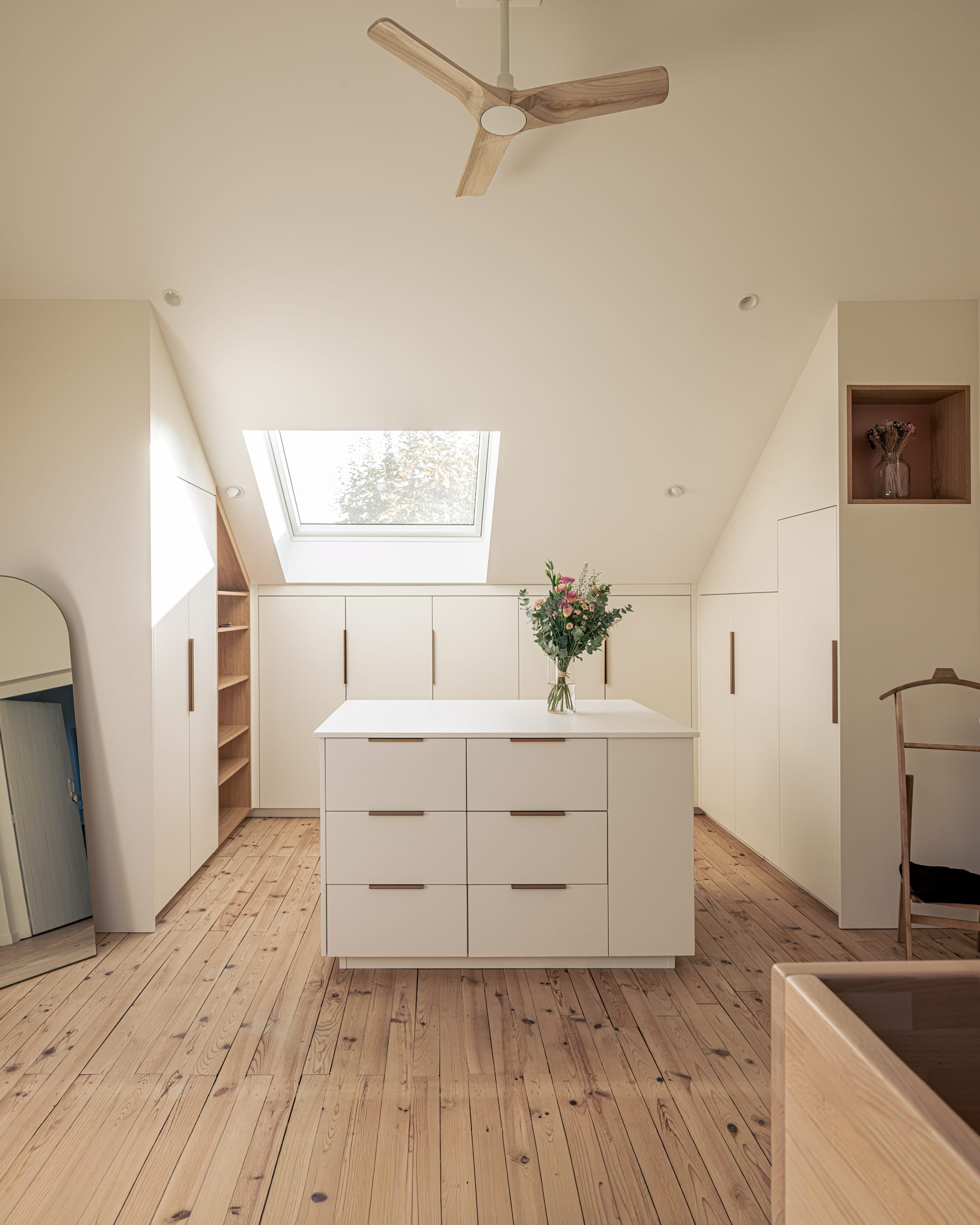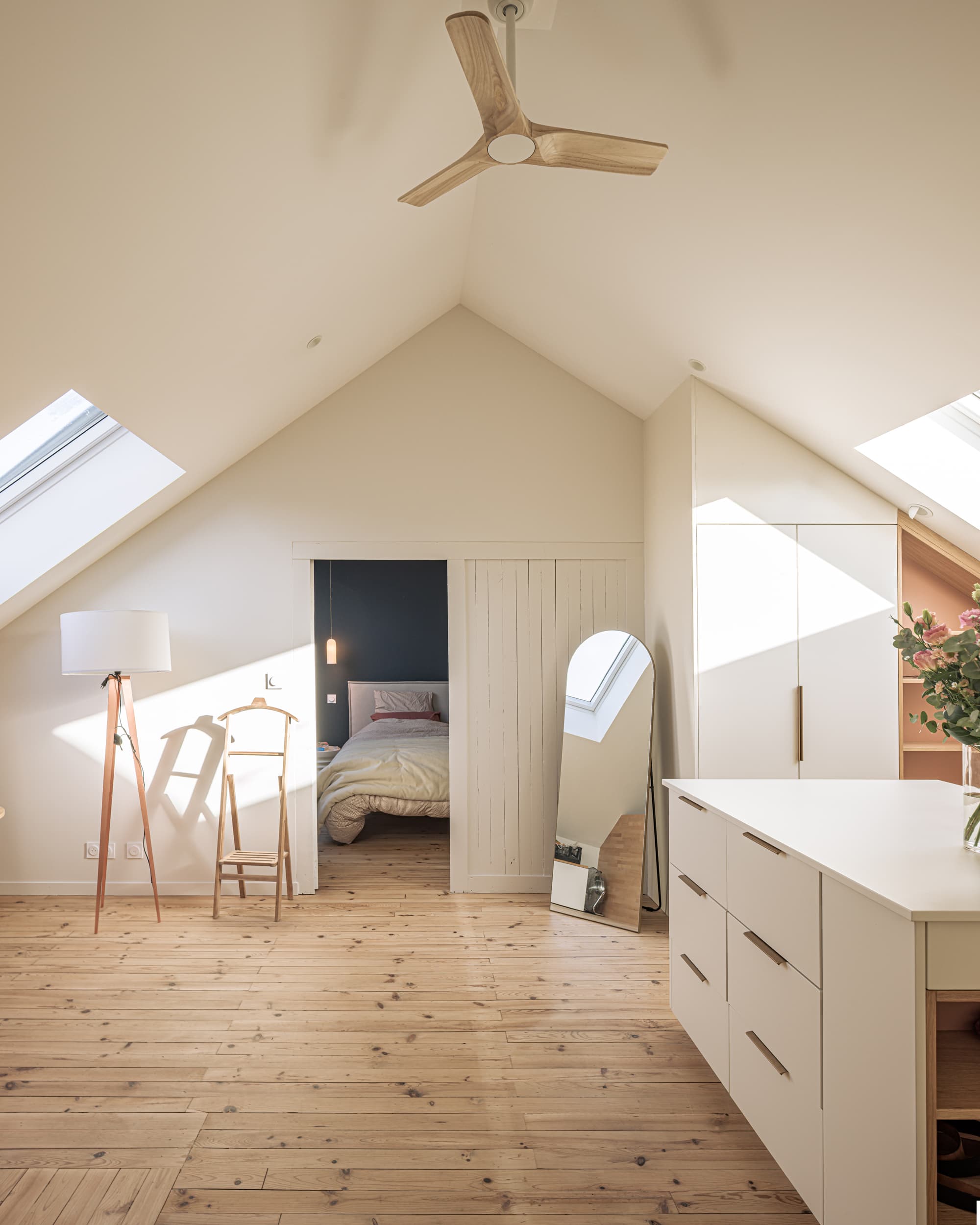 Enfin, la conception de nombreux rangements sur mesure a permis d’optimiser l’usage des espaces. Au-delà de leur fonction, ces éléments participent pleinement à l’identité du projet et à la qualité architecturale des lieux.