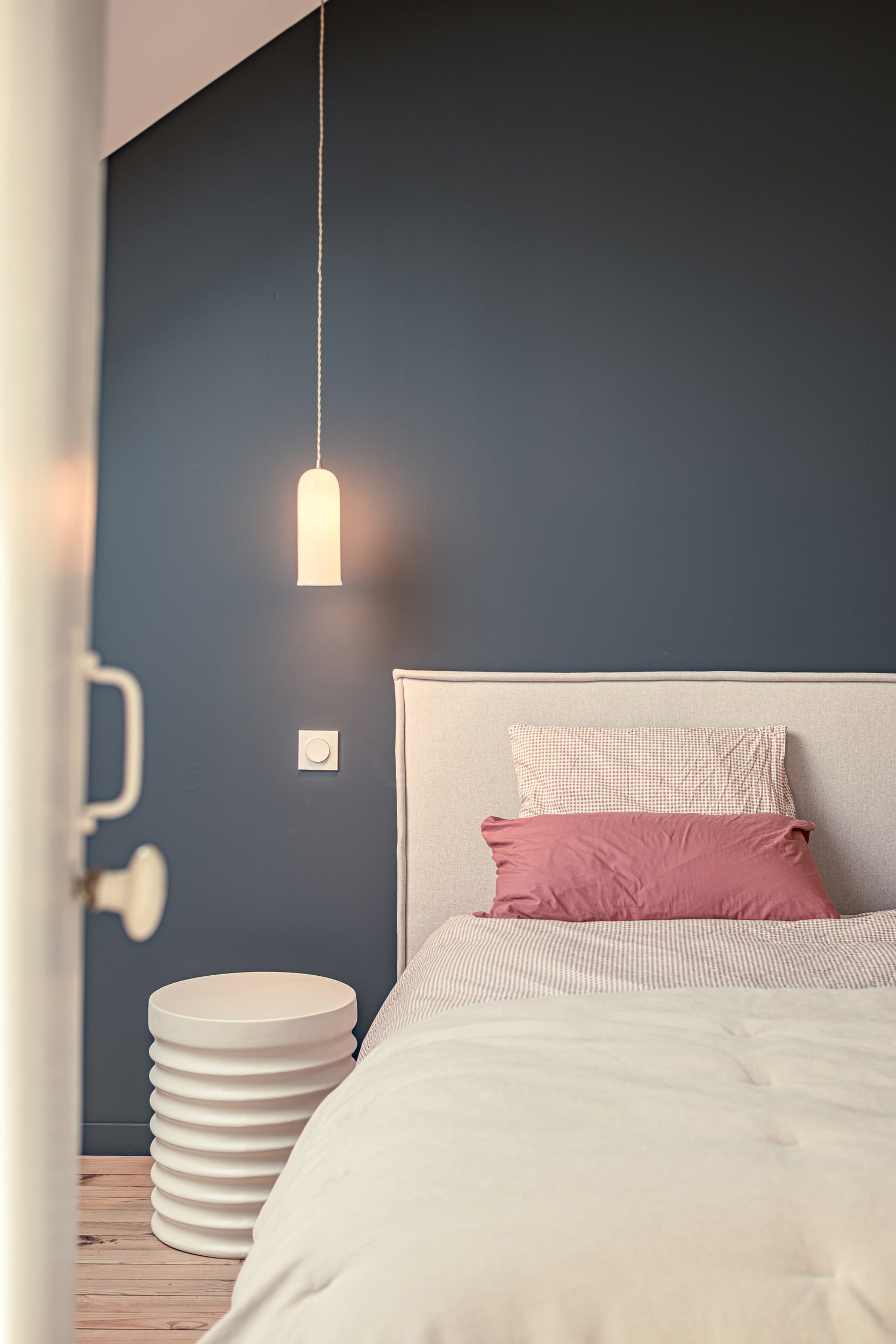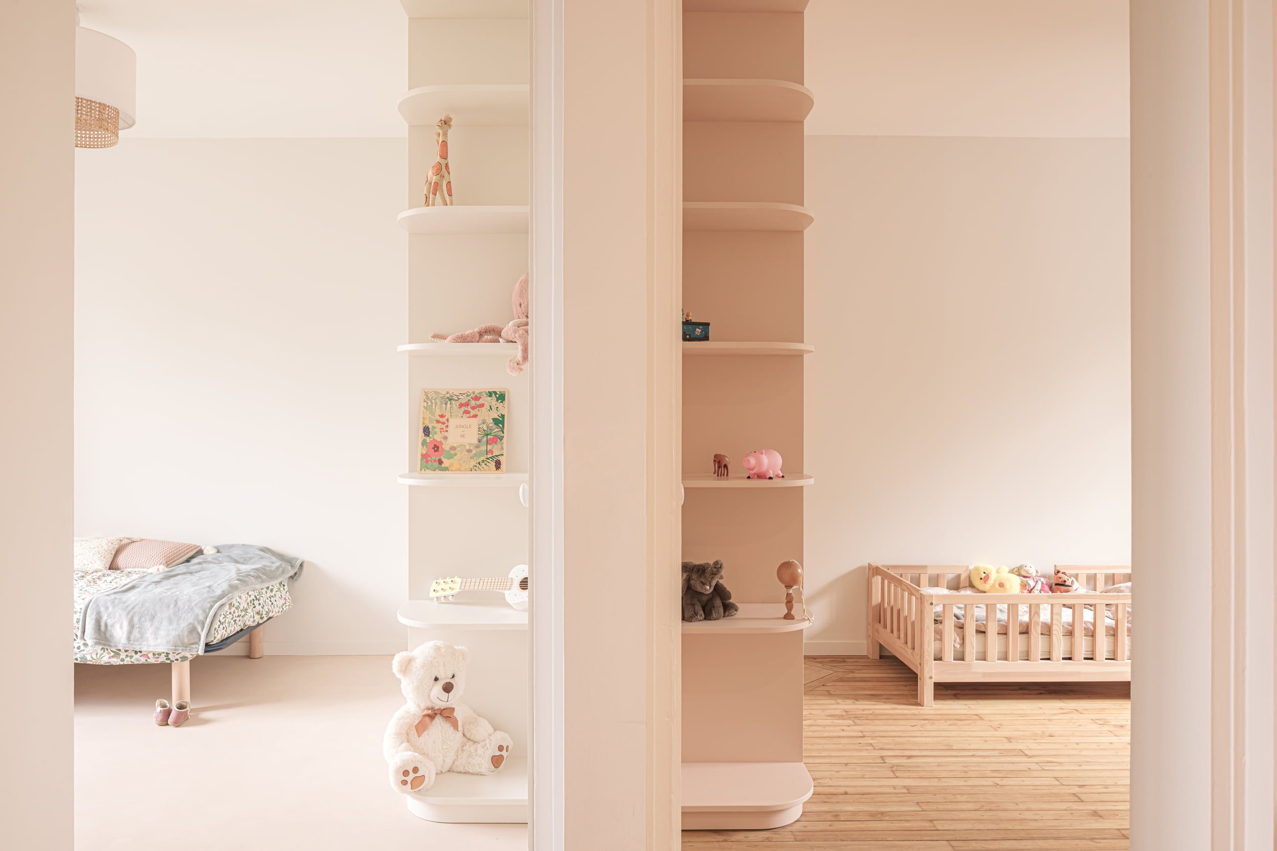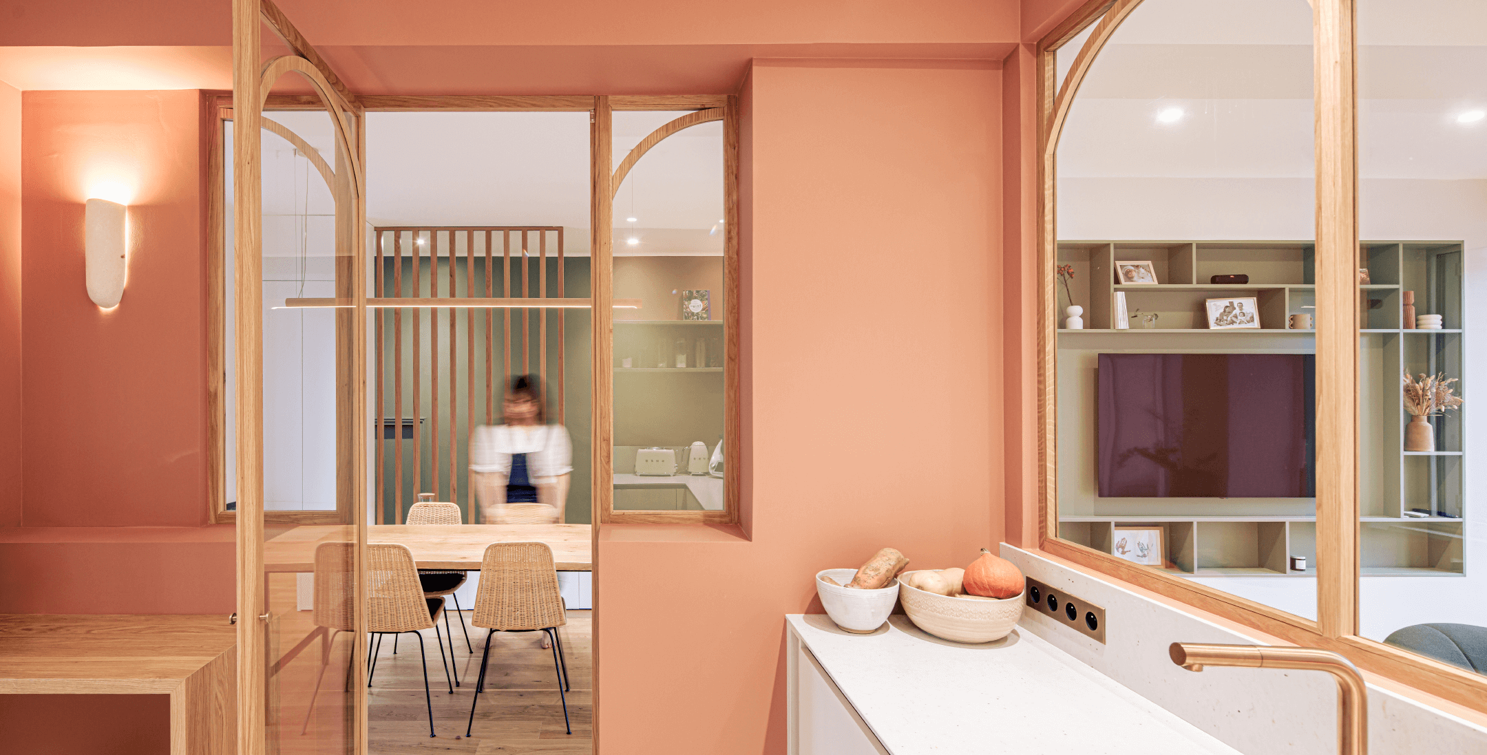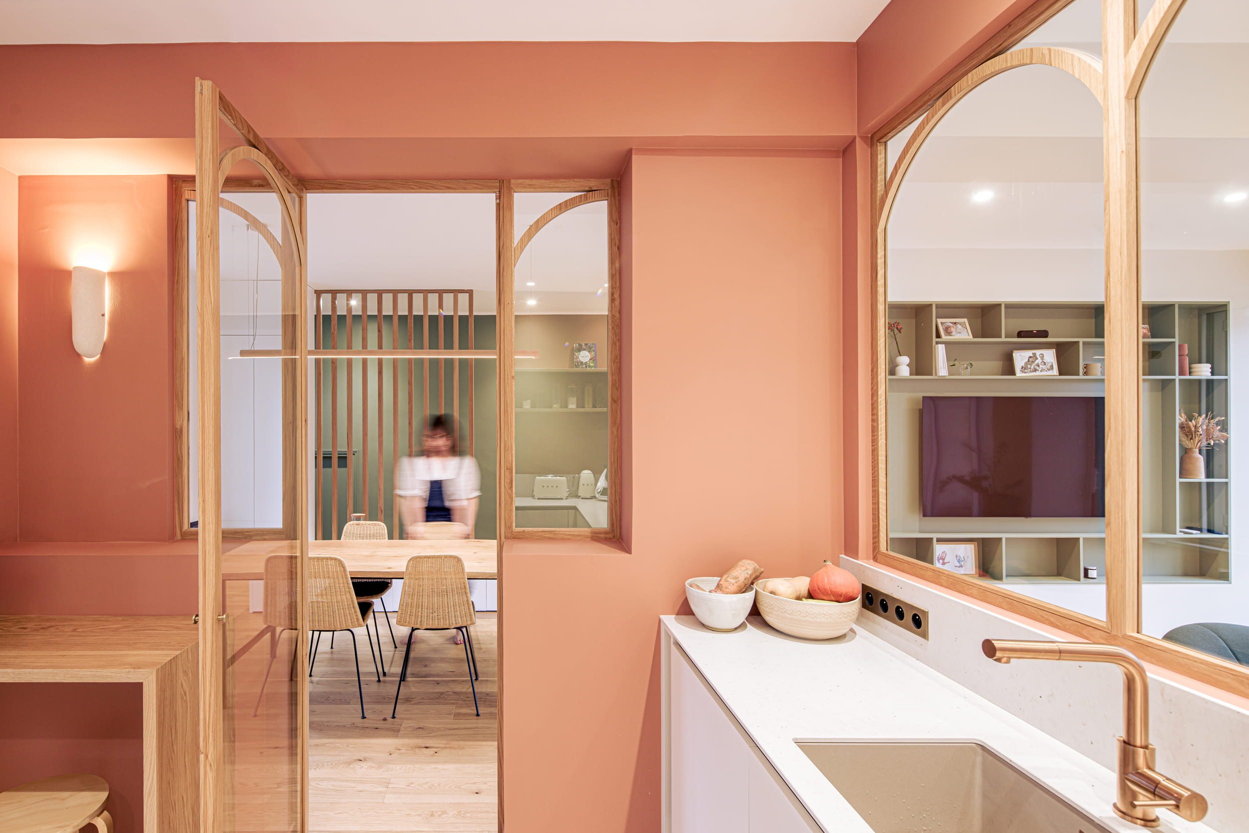 Enfin, la conception de nombreux rangements sur mesure a permis d’optimiser l’usage des espaces. Au-delà de leur fonction, ces éléments participent pleinement à l’identité du projet et à la qualité architecturale des lieux.