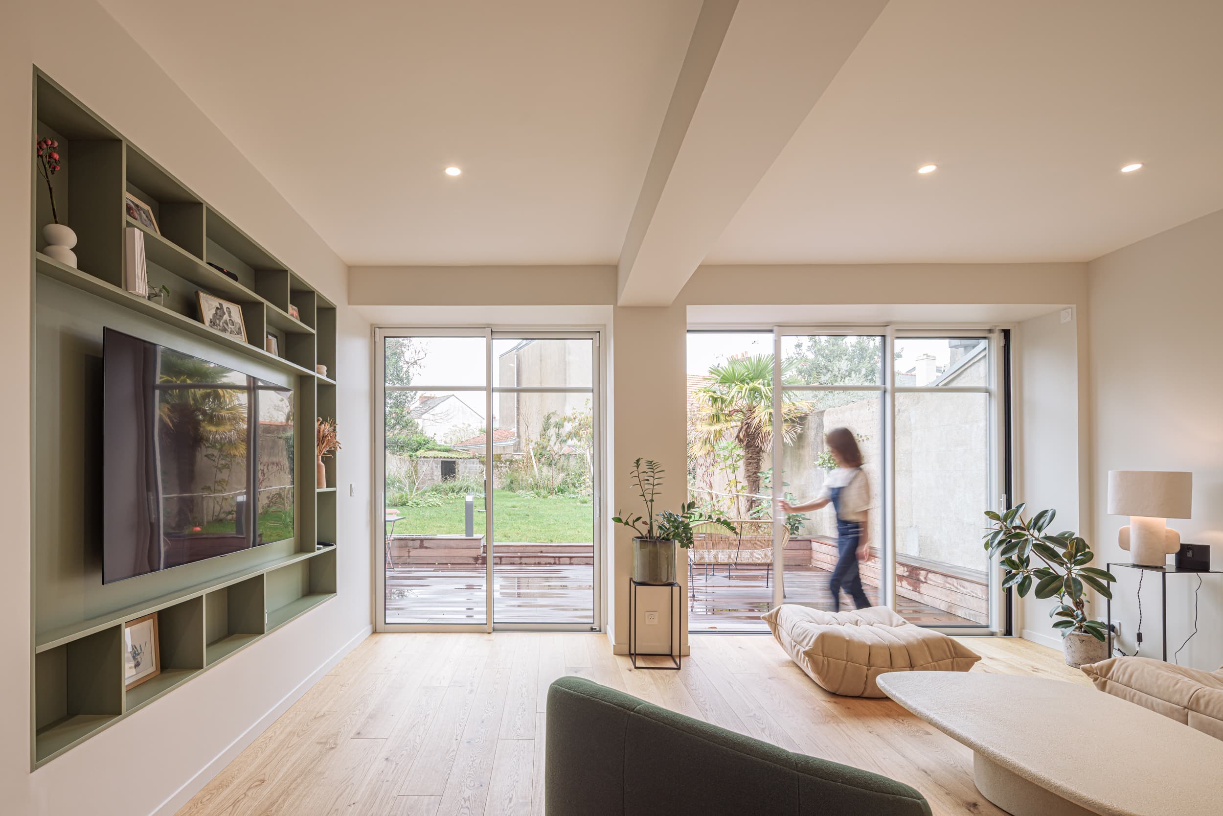 La maison, de grande ampleur et idéalement située, présentait un fort potentiel de transformation. Issue d’une division ancienne en plusieurs appartements, son organisation intérieure était fortement cloisonnée et totalement déconnectée du jardin.