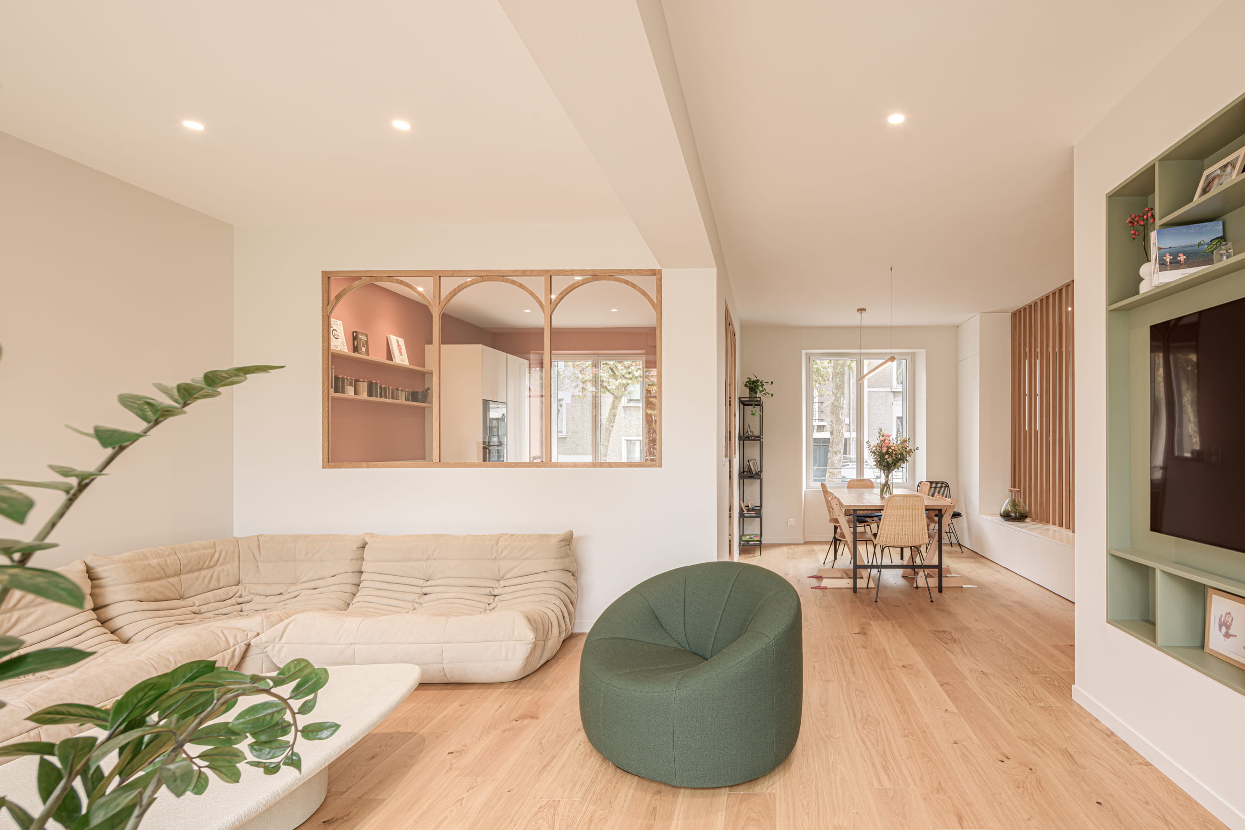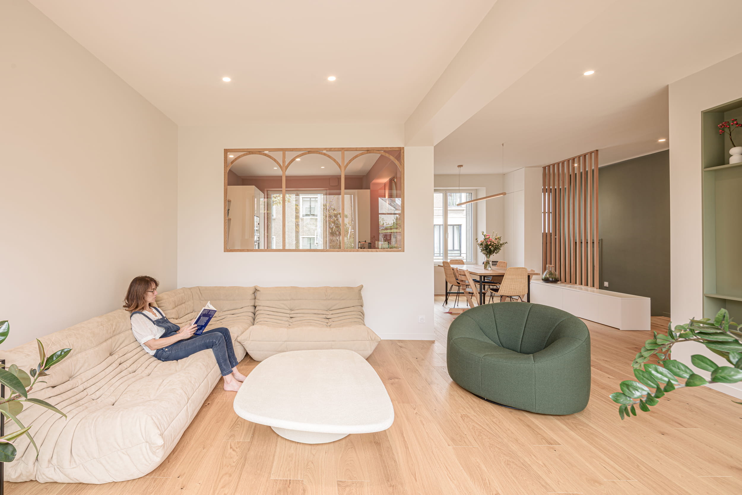 L’utilisation de claustras et de verrières permet de définir les différents usages sans rompre les perspectives, renforçant ainsi la sensation d’espace et la lisibilité des volumes. Les pièces de vie bénéficient désormais de généreux apports de lumière naturelle et d’une relation privilégiée avec le jardin.