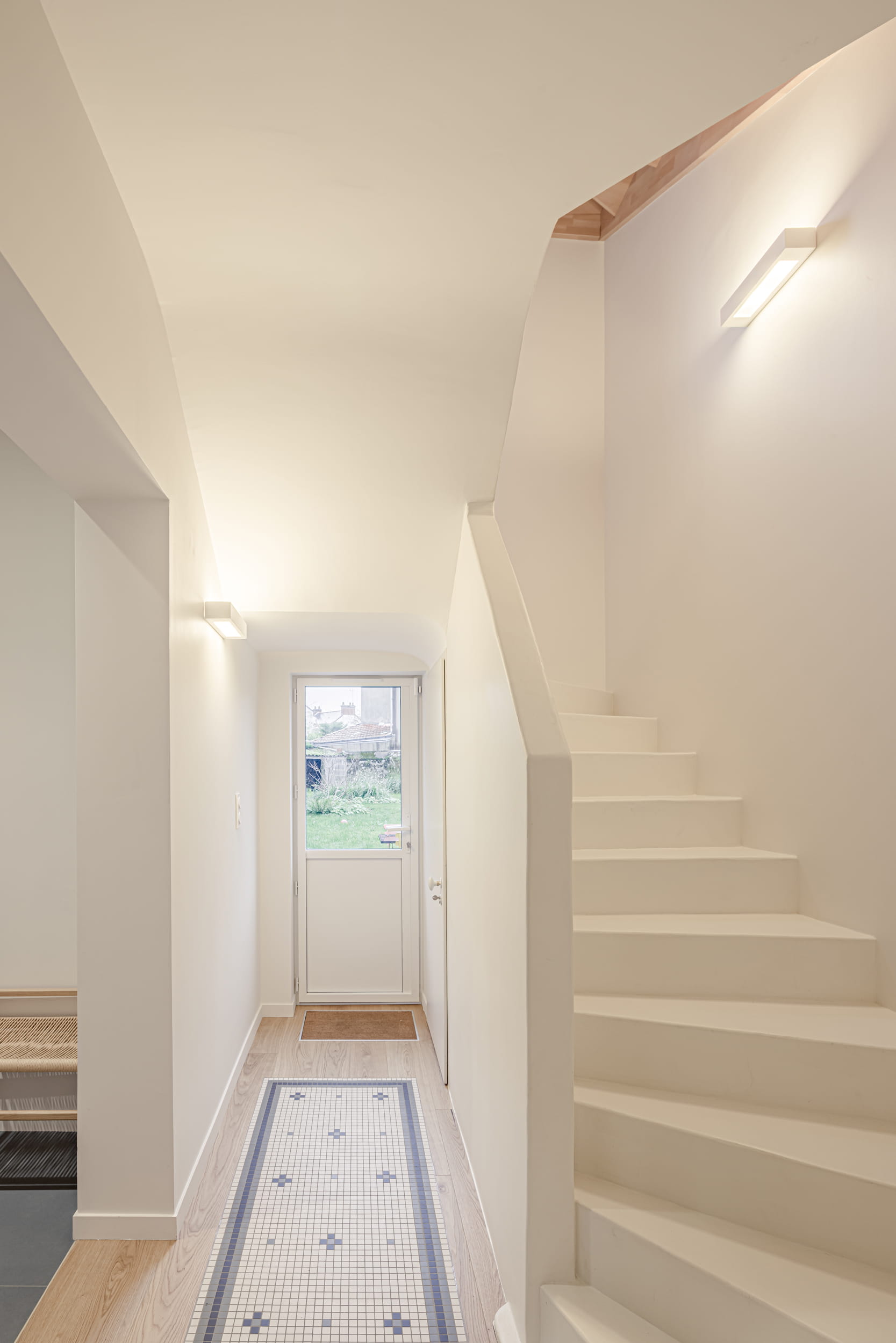 L’entrée, auparavant marquée par un long couloir, a été entièrement ouverte et réorganisée. Un mobilier de rangement sur mesure permet de structurer l’espace tout en conservant les apports de lumière.